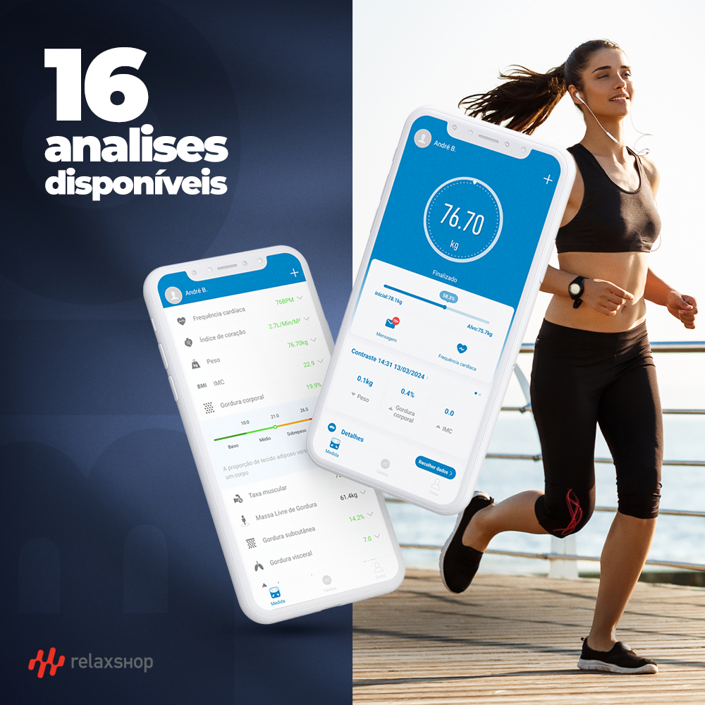BALANÇA BIOIMPEDÂNCIA BIO PLUS PRETA MODELO NOVO: 2024/2025 COM 2 TELAS DE MEDIÇÃO A ÚNICA NO BRASIL A Balança ideal para te acompanhar no controle de peso e saúde, você encontra na Relaxshop. Perfeita para analisar suas medidas corporais e te ajudar a descobrir o desempenho do seu corpo em uma dieta e atividades físicas. Ela traz informações com detalhamento e facilidade através de seu painel digital com gráficos que identificam diariamente as informações do seu corpo registrando o histórico de cada usuário. Indicada para medição: - Frequência Cardíaca; - Índice de coração; - Peso; - IMC; - Gordura corporal; - Taxa muscular; - Massa livre de gordura; - Gordura Subcutânea; - Gordura visceral; - Água corporal; - Massa muscular esquelética; - Massa muscular; - Massa óssea; - Proteína; - TMB; - Idade metabólica. Diferenciais: - Conexão com aparelhos IOS E Android via Wireless; - Memória para até 24 usuários; - Pesagem para bebês que permite ser feito no seu colo; - Vidro temperado; - Visor LCD; - Relatório de frequência cardíaca. Dados Técnicos: - Peso: 1,600Kg; - Dimensão: 28X28X2cm; - Dimensão do visor: 6,2x10,3cm; - Forma de usar: 4 pilhas AAA; - Marca: Relaxshop; - Garantia: 12 meses; - Cor: Preto; - Frequência: 50-60 Hz; - Capacidade: 180Kg (máximo). ITENS INCLUSO 1 - Balança Bio PLUS (modelo: ano 2024/2025) 1 - 4 Pilhas AAA 1 - Manual de instrução
