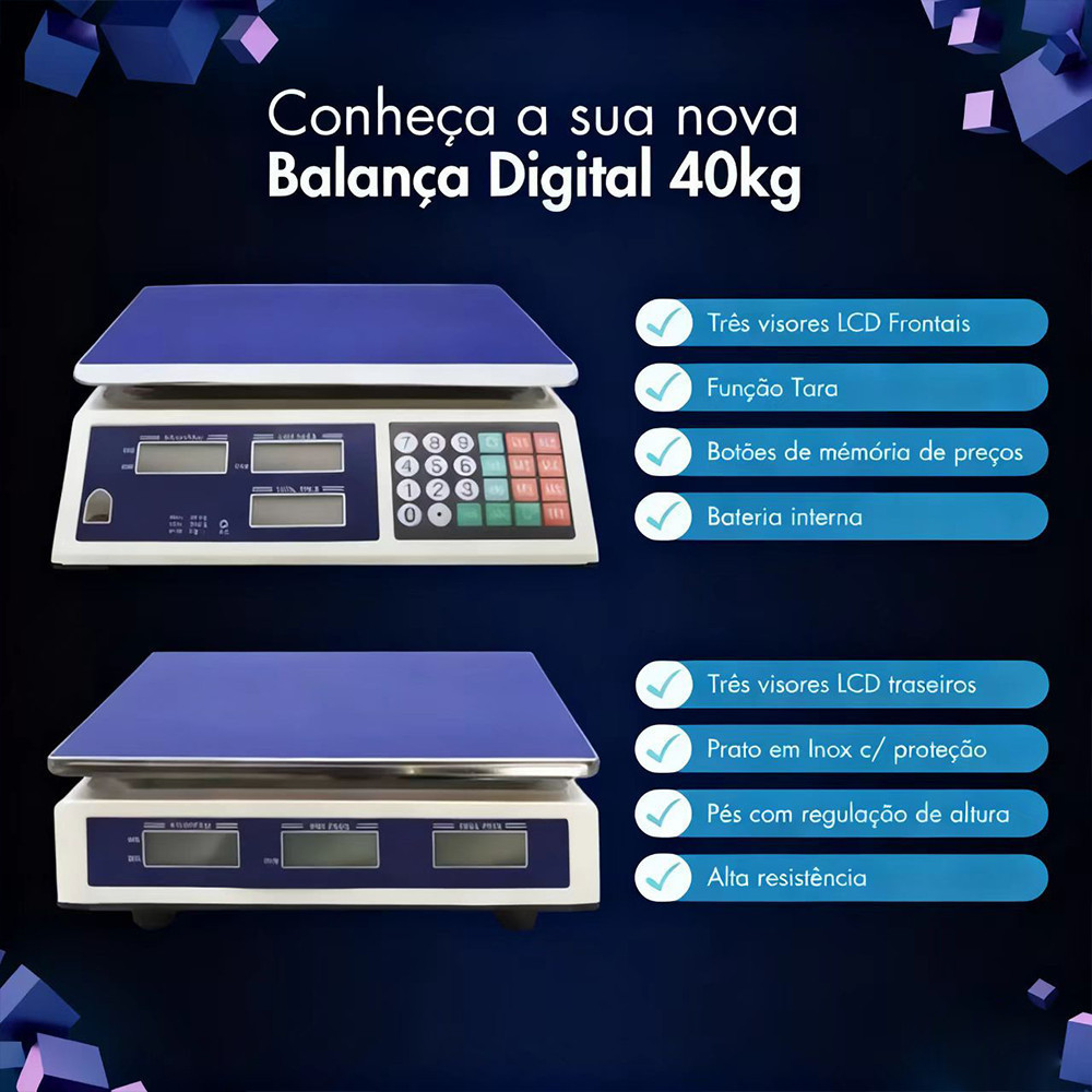 | Balança Digital Comercial 40kg Bivolt 110/220V Modelo Eletrônico Re... este produto | R$ 189,00 | 37% | 4.9/5 | 5 |