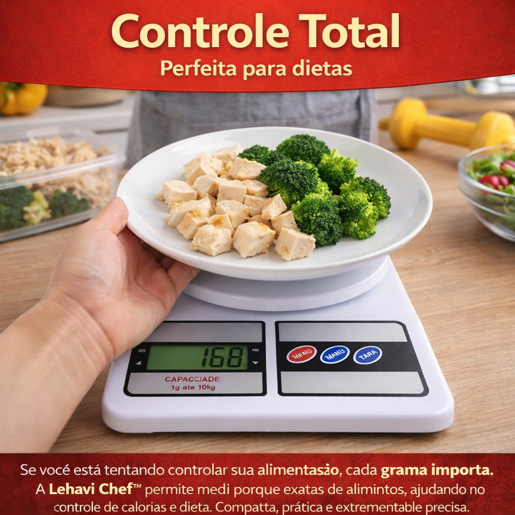 A Lehavi Chef™ é a balança digital de precisão que transforma qualquer cozinha comum em um verdadeiro espaço de chef profissional. Quantas vezes você já tentou seguir uma receita da internet e algo simplesmente deu errado? O bolo não cresce, o molho fica estranho ou a massa perde o ponto perfeito. Na maioria das vezes, o problema não é a receita… é a quantidade errada dos ingredientes. Com a Lehavi Chef™, cada ingrediente é medido com precisão absoluta, garantindo resultados muito mais consistentes e profissionais. Agora imagine ter controle total sobre o que você prepara. Seja para acertar receitas, controlar porções na dieta ou preparar pratos mais elaborados, a Lehavi Chef™ entrega confiança em cada preparo. Nada de adivinhar medidas ou desperdiçar ingredientes caros. Apenas coloque o alimento na plataforma e veja o peso exato aparecer no visor digital. Por que escolher a Lehavi Chef™? Você sente o prazer de acertar cada receita com perfeição. Economiza ingredientes ao medir tudo com exatidão. Cozinha com a confiança de um chef profissional. Sente orgulho ao preparar pratos impecáveis. Evita erros comuns que estragam receitas. Ganha praticidade com uma ferramenta simples e inteligente. E ainda transforma sua cozinha em um ambiente mais organizado e eficiente. Medidas: 20cm x 14cm x 3,5cm Material: Plástico resistente e componentes eletrônicos de alta precisão. 🚨 ATENÇÃO: Devido à alta procura, restam poucas unidades da Lehavi Chef™ disponíveis no estoque atual. Garanta a sua agora antes que o lote acabe e o preço aumente no próximo envio