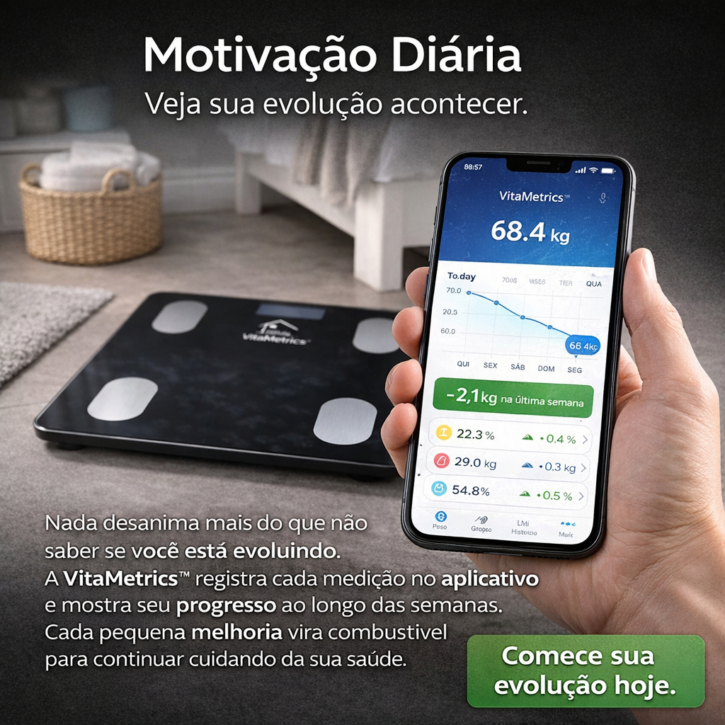 VitaMetrics Pro™ – A inteligência que revela o verdadeiro estado do seu corpo. Cuidar do corpo nunca foi apenas sobre subir em uma balança e ver um número. Muitas pessoas fazem dieta, tentam treinar, se esforçam… mas acabam frustradas porque não conseguem entender se estão realmente evoluindo. Ver apenas o peso não mostra a verdade, e isso faz muita gente desistir antes mesmo de alcançar resultados. Com a VitaMetrics Pro™, cada medição se transforma em conhecimento real sobre seu corpo. Em segundos, a tecnologia de bioimpedância revela informações profundas como gordura corporal, massa muscular e evolução física diretamente no seu celular. Agora você acompanha cada progresso e transforma pequenos avanços em motivação para continuar. Por que escolher a revolucionária VitaMetrics Pro™ Ela transforma dados do seu corpo em motivação diária. Ela mostra aquilo que balanças comuns escondem. Ela entrega tecnologia avançada acessível dentro da sua casa. Ela traz a satisfação de ver sua evolução real todos os dias. Ela desperta orgulho ao acompanhar seu progresso físico. Ela faz você sentir que finalmente tem controle da própria saúde. Ela cria disciplina natural ao ver resultados aparecerem. Capacidade máxima: até 140kg Material: vidro temperado resistente + sensores de bioimpedância de alta precisão ⚠ ATENÇÃO: Devido à alta demanda pela VitaMetrics Pro™, restam poucas unidades disponíveis neste lote promocional. Garanta agora a sua antes que o estoque esgote e o preço seja reajustado.