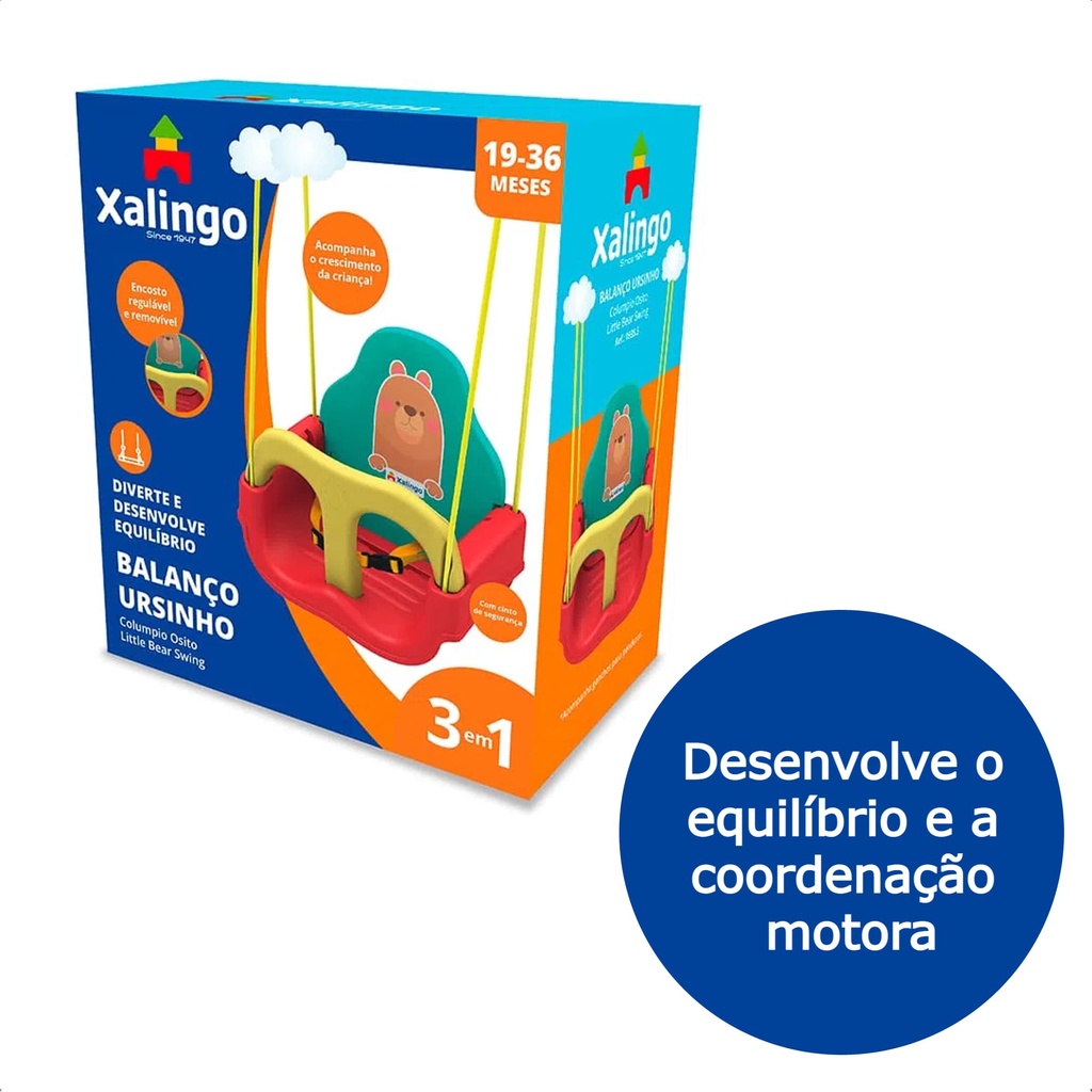 As crianças agora podem se divertir no embalo do Balanço Infantil 3 em 1 Ursinho da Xalingo Brinquedos. Um Brinquedo que diverte e desenvolve o equilíbrio e a coordenação motora! Contém cinto de segurança, e pode ser usado com ou sem encosto e barra de proteção. O encosto é regulável e acompanha cordas em plástico. Indicado para crianças de 19 a 36 meses. É diversão que não acaba mais! Características: - Marca: Xalingo - Modelo: 09355 * Imagens meramente ilustrativas. Especificações Técnicas: - Material: Plástico - Peso Máximo Recomendado: 23kg - Idade Recomendada: Até 4 anos - Inmetro: CE-BRI/IQB 005923 - Cor Principal: Verde e Vermelho. - Medidas: (AxLxC): 38,7x30,9x40,5cm Observação: O cinto de segurança deve ser afivelado e ajustado à criança. Este brinquedo deve ter a supervisão de um adulto durante o uso. Conteúdo da Embalagem: - Balanço Infantil 3 em 1 - Cinto de Segurança.