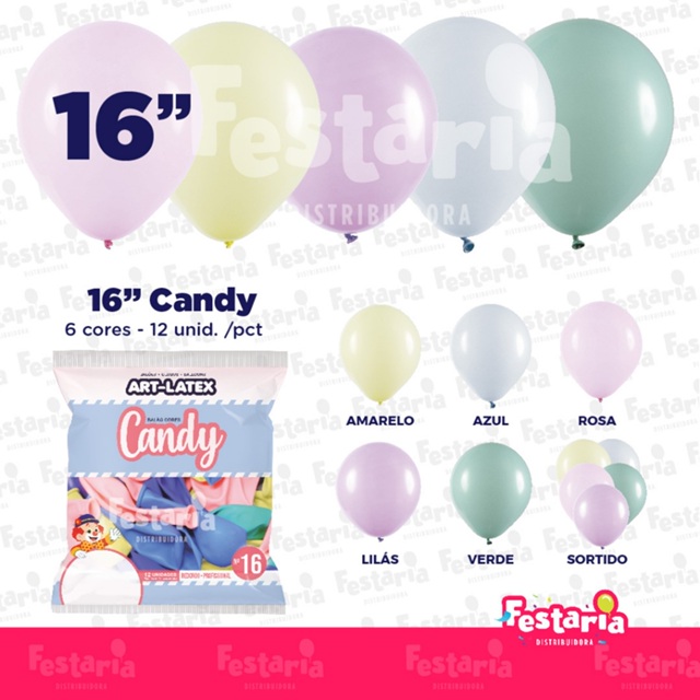 | Balão Candy 16" Diversas Cores – 12 Unid – Art Latex este produto | R$ 31,80 | — | 4.9/5 | 52 |