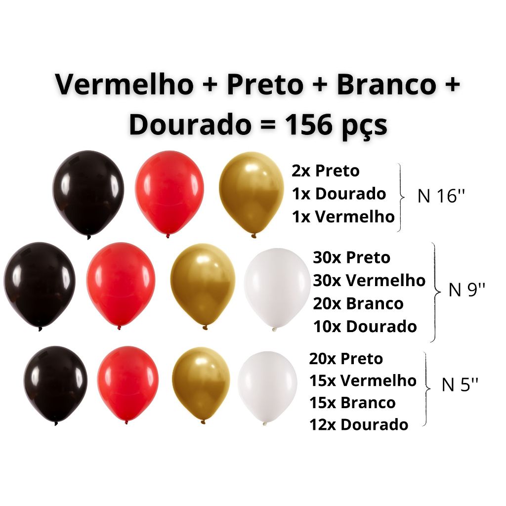 Balão de aniversário kit 156 pçs - Vermelho + Preto + Branco + Dourado para decoração de Festas.