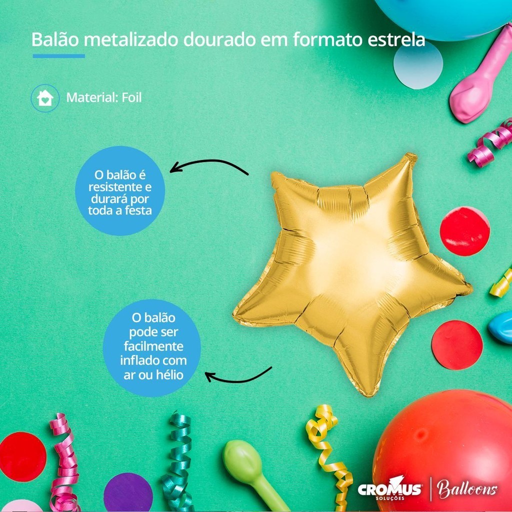 Adicione um toque de charme e elegância à sua próxima festa, casamento ou evento com o Balão Metalizado em estrela para decoração de Festas. <br>Feito de materiais de alta qualidade, este balão garante durabilidade durante todo o evento. Com o tamanho de 24 polegadas, ele chamará atenção e será facilmente notado em qualquer lugar que seja colocado.<br><br>O design é perfeito para complementar qualquer decoração festiva de maneira fácil e acessível, adicionando um toque de elegância e sofisticação. <br>O balão pode ser facilmente inflado com ar ou hélio e tem uma válvula de fechamento automático para fácil vedação. É reutilizável, permitindo que você use novamente em futuras festas.<br>Use-o como um destaque em um arranjo de balões ou como uma peça central em uma mesa. Compre agora e faça da sua próxima festa um sucesso inesquecível!<br><br>Tamanho: aproximadamente 60 cm.<br>Quantidade: 1 unidade no pacote.<br>Cor: dourado<br>Formato: estrela.<br>