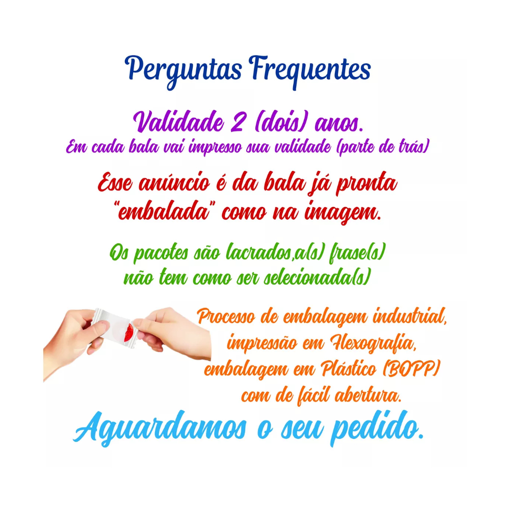 Balas JÁ Personalizadas: O Mimo Perfeito para Encantar Clientes em Compras, Eventos e Escritórios. Surpreenda seus clientes com nossas balas personalizadas! Duras, cilíndricas, coloridas e disponíveis em uma variedade de sabores deliciosos: abacaxi, cereja, framboesa, limão, melancia, morango, tangerina e uva. Perfeitas para diversas ocasiões: Clientes: Adicione um mimo especial às suas vendas. Presentes: Enriqueça caixas de presentes, saquinhos com bilhetes ou cartões de agradecimento com nossas balas. Recepções: Encante seus visitantes disponibilizando balas personalizadas na recepção. Eventos: Ofereça balas em locais estratégicos para que seus clientes conheçam e apreciem sua marca. Nota Importante: As balas são sortidas e não é possível escolher frases ou sabores específicos. Detalhes do Produto: Embalagem: Industrial super higiênica em plástico (BOPP) de fácil abertura. Tipo de impressão: Flexografia de alta qualidade. Tamanho: Aproximadamente 4,5 cm. Trabalhamos com as melhores marcas do mercado para oferecer balas de sabores variados que agradam a todos os tipos de clientes. Adicione um detalhe especial às suas vendas com nossas balas sortidas e saborosas! Se precisar de mais informações, estamos à disposição para ajudar.