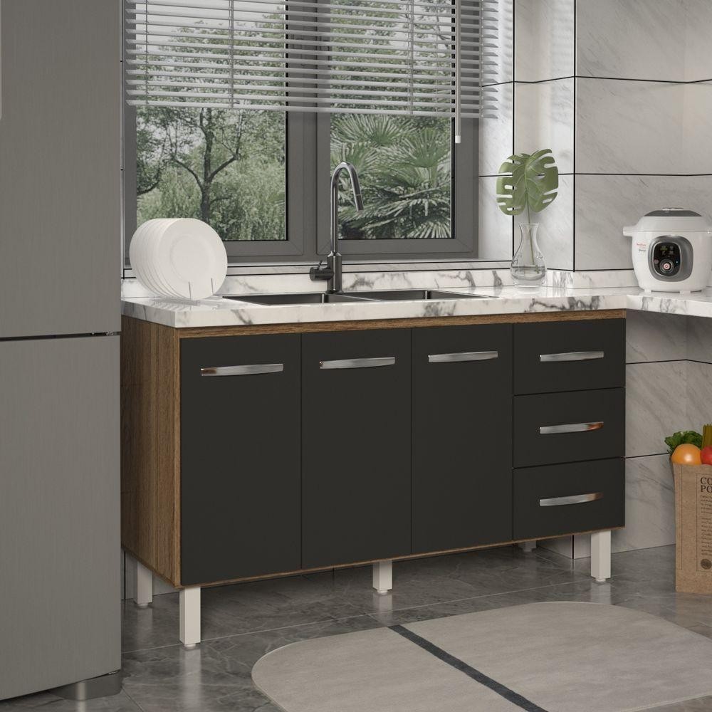 Balcão Armário Cozinha Gabinete Pia De 140 Cm Carine Com 3 Portas E 3 Gavetas Preto