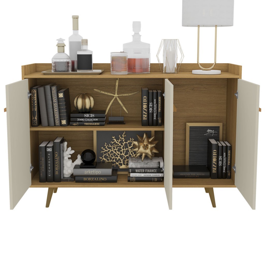 Balcão Buffet 3 Portas com Pés de Madeira Quartzo Cinamomo/Off White - Móveis Bechara