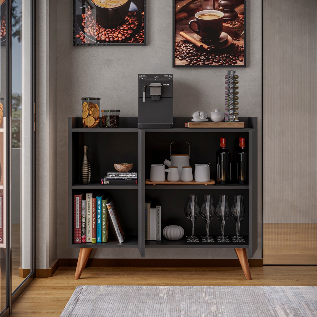 Balcão buffet aparador 2 portas para casa com pés de madeira divisórias na cor preto