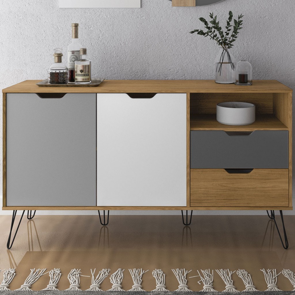 Balcão Buffet Estocolmo 2 Portas 2 Gavetas Carvalho/Grafite/Branco/Prata - Artely