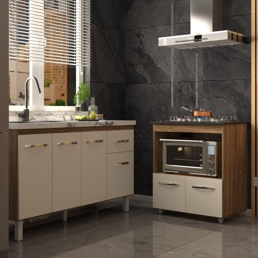 Balcão Cozinha Gabinete De Pia 140cm Camila E Balcão Evelyn Para Fogão Cooktop 5 Bocas E Forno Elétrico Savana Off White