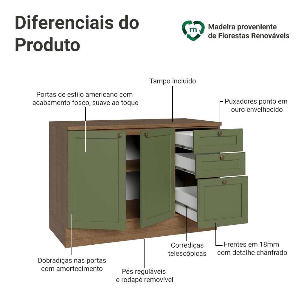 Balcão de Cozinha 120 cm 2 Portas 3 Gavetas Rustic/Verde Vik Madesa