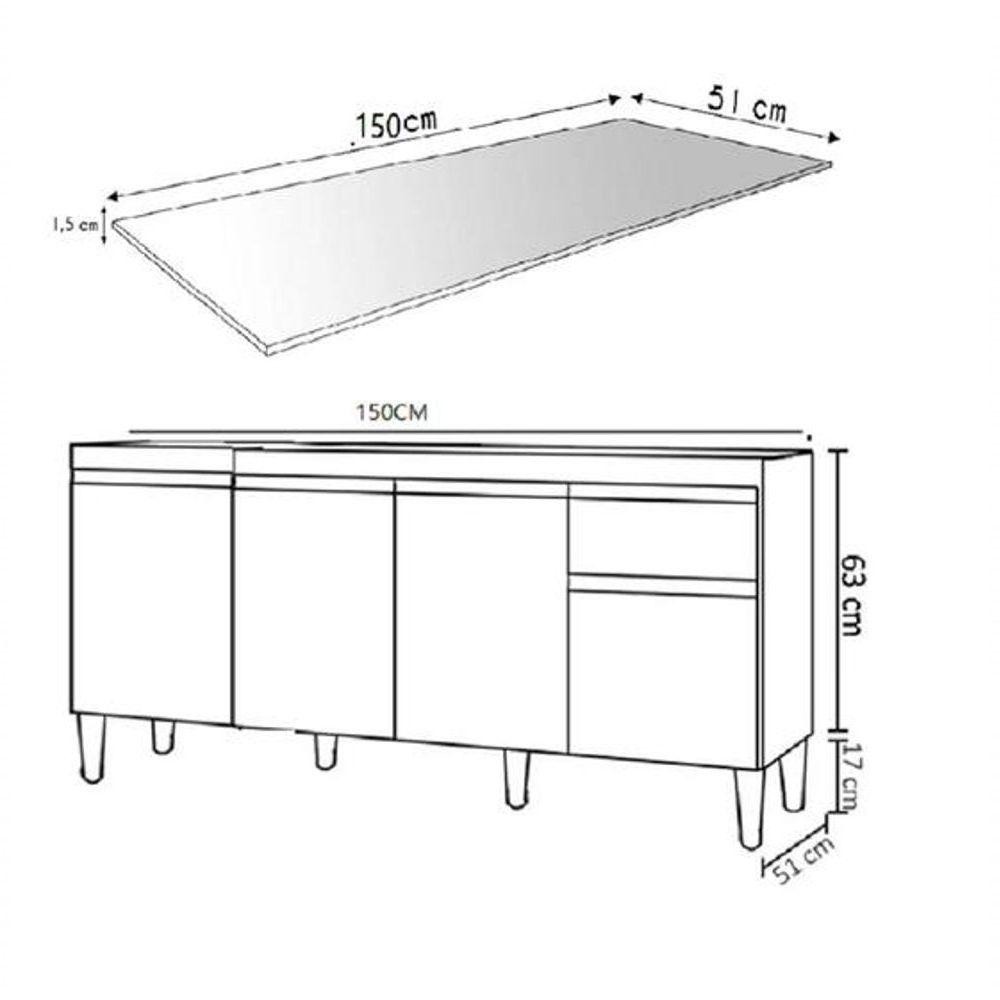 Balcão De Cozinha 150cm Tatiane 4 Portas 1 Gaveta Com Tampo Cinza