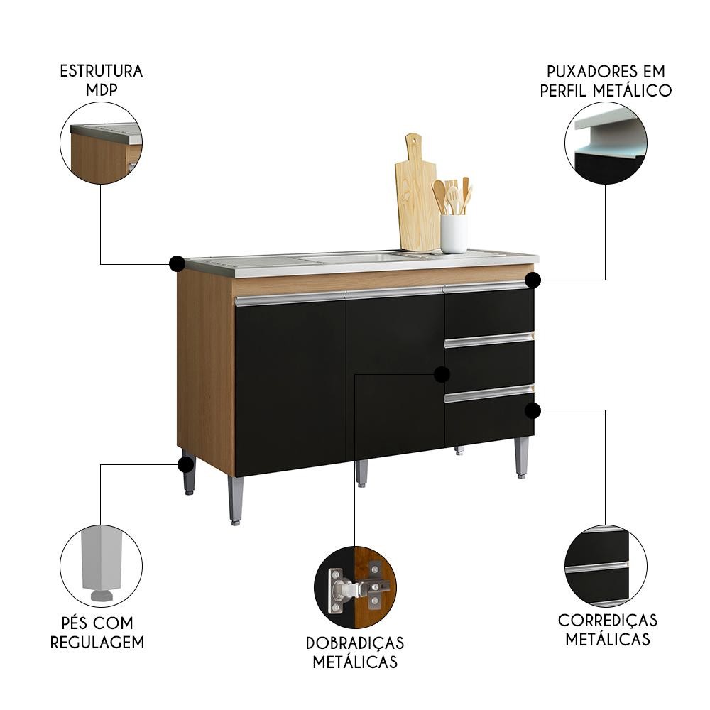 Balcão de Cozinha Com Pia Inox 100cm 3 Gavetas Andréia Amêndoa/Preto - AJL Móveis