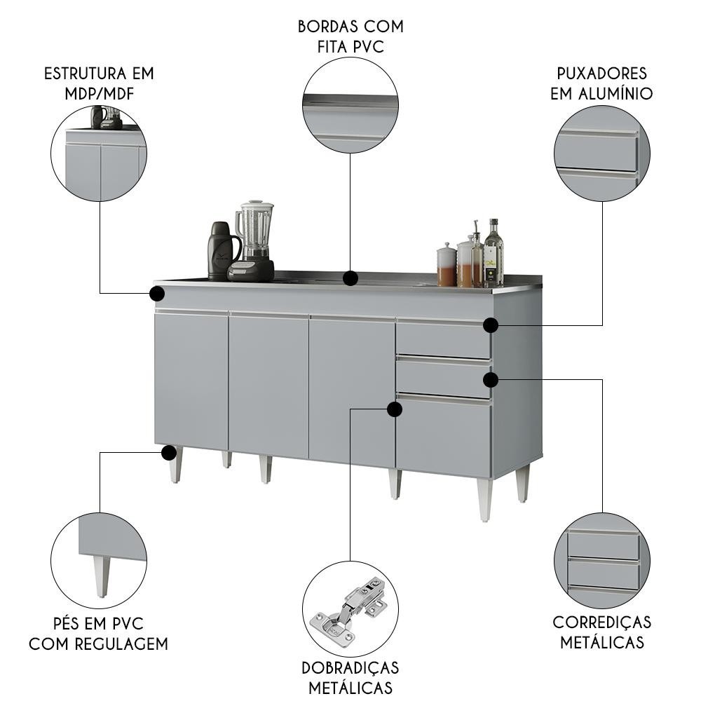 Balcão de Cozinha com Pia Inox 150cm 4 Portas Marrocos Cinza Claro - Lumil