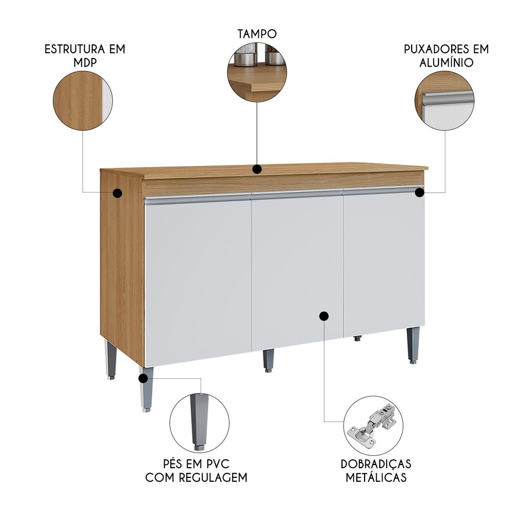 Balcão de Cozinha com Tampo 120cm 3 Portas Manu Amêndoa/Branco - AJL Móveis