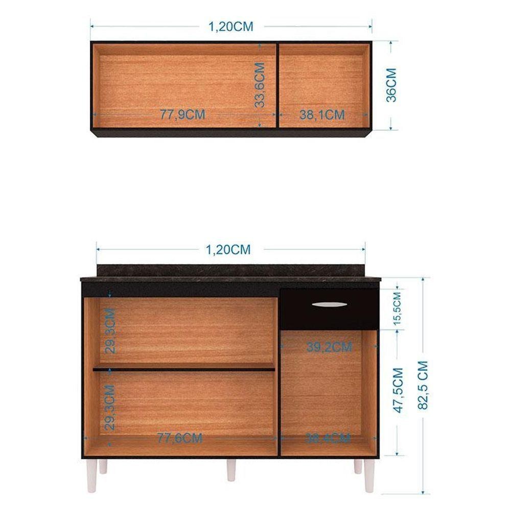 Balcão De Cozinha Com Tampo E Armário Aéreo 120 Cm Preto - Poquema