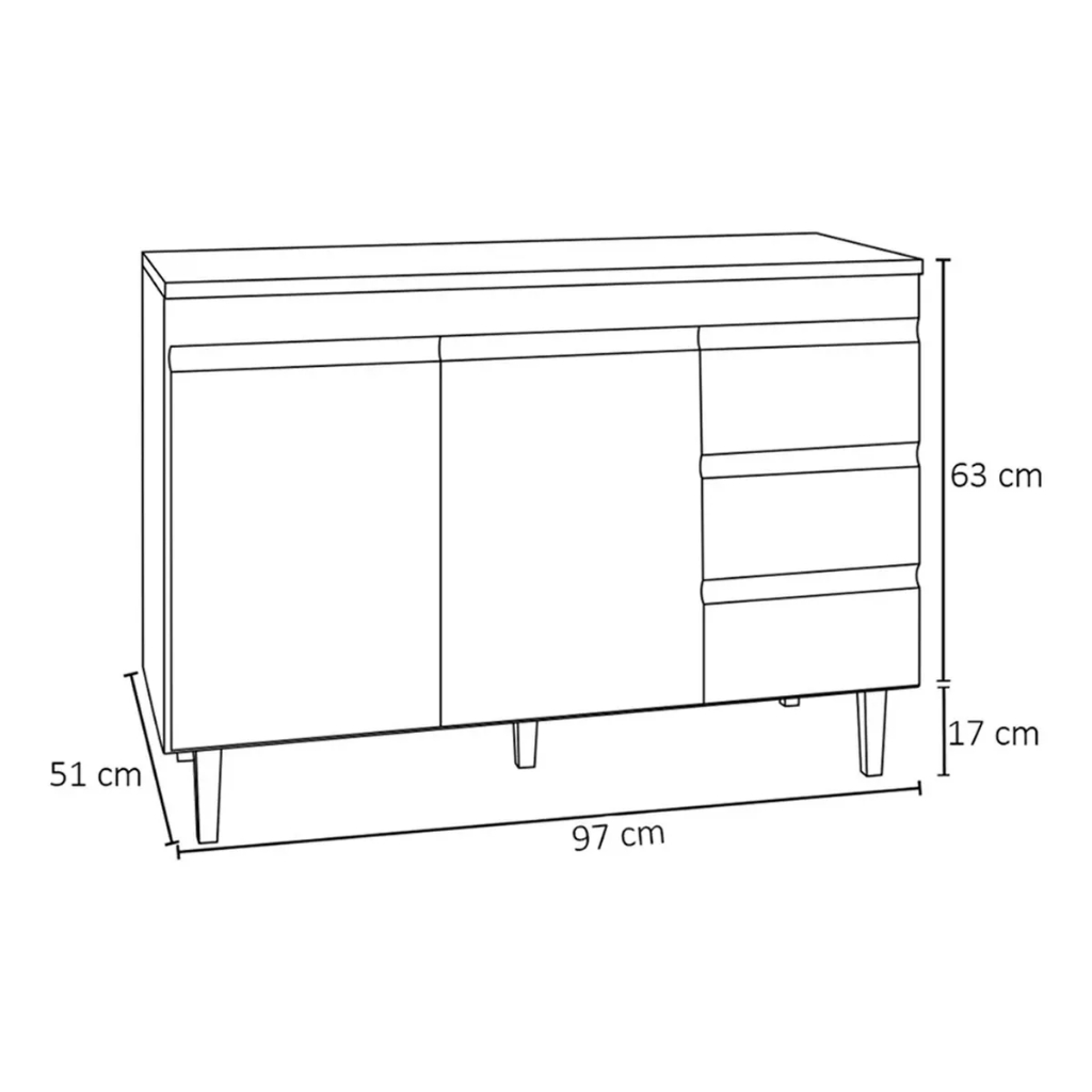 Características: Material da Estrutura: mdp Acabamento: Pintura uv Possui 2 portas Possui 3 gavetas Dobradiças em aço Puxadores embutidos Pés em pvc Corrediças metálicas Design moderno Acompanha Tampo: Sim Medidas do Produto Montado: ALTURA: 80 cm LARGURA: 97 cm PROFUNDIDADE: 51 cm Peso: 28 kg