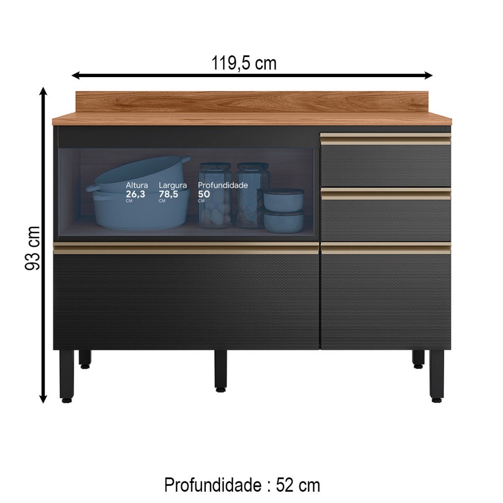 Dimensões: - Altura: 93,00 cm - Largura: 119,50 cm - Profundidade: 52,00 cm - Peso: 54,480 kg Descrição: O(a) Balcão de Cozinha Proença 1 Porta 4 Gavetas 100% Mdf Nogueira/Carbono - Demóbile é produzido em 100% MDF na escala de brilho Fosca com Textura, e possui um grau de dificuldade de montagem: Difícil.Seu revestimento/acabamento é: Pintura UV. Infelizmente a Loja não oferece serviço de montagem, deixamos essa informação bem clara em todas as nossas páginas de produto. Onde especificamos que os móveis chegarão desmontados, e que a montagem fica por conta do cliente. Como não oferecemos esse serviço não embutimos o mesmo no preço dos produtos, ou seja, maior economia para você! Todos os nossos móveis também acompanham o manual de montagem, e caso você queira, pode realizar a montagem você mesmo, sempre especificamos os graus de montagem dos produtos. Nos casos de grau baixo e médio, com pouco ou nenhum conhecimento, você mesmo pode efetuar a montagem, e fazer essa economia. Apenas nos graus de montagem alto, recomendamos a contratação de um montador com experiência, visto que são montagens mais complicadas. A montagem é feita com Parafusos e cavilhas.. Este móvel é indicado para que seja utilizado no(a) Cozinha, dando um toque especial no cômodo de sua casa. Para que você mantenha seu produto sempre em ótimo estado, recomendamos que use apenas um pano seco ou levemente umedecido, sem o uso de quaisquer produtos abrasivos. A Loja garante aos clientes, 90 dias de garantia nos produtos, porém, recomendamos que entre em contato com o fornecedor/marca do produto, pois o mesmo(a), pode garantir um prazo maior de garantia. Lembrando ainda que: quaisquer objetos decorativos que aparecem nas imagens, não acompanham o produto. Características: - Espessura da Estrutura: 12mm, 15mm, 20mm - Possui Gavetas?: Sim - Quantidade de Gavetas: 4 - Peso Suportado nas Gavetas (Kg): 10 Kg - Material das Corrediças: Alumínio - Tipo da Corrediça: Telescópica - Possui Portas?: Sim - Quantidade de Portas: 1 - Material da Porta: MDF - Espessura da Porta: 15 mm - Tipo de Porta: Portas Basculantes - Material das Dobradiças: Caneco Com Amortecimento e Pistão a Gás - Possui Vidro?: Não - Possui Espelho?: Não - Possui Prateleiras?: Sim - Quantidade de Prateleiras: 1 - Peso Suportado nas Prateleiras:: 10 Kg - Possui Puxadores?: Sim - Material do Puxador: Metal - Possui Ripamento?: Não - Linha ou Coleção: Proença - Montagem Invertida?: Não Pode ser Montado Invertido - Cor interna: Marrom - É frágil?: Não - Possui distanciador de corrediça?: Sim - Possui Nicho?: Não - Acompanha Tampo para Cooktop: Não - Material da Estrutura: 100% MDF - Escala de Brilho: Fosca com Textura - Material do Tampo: MDF - Acompanha Tampo para Pia?: Sim - Espessura do Tampo (mm): 20 - Possui Espaço para Pia?: Sim - Possui Rodízios?: Não - Acompanha Pia?: Não - Tamanho Pia Indicado (LXP): 120 x 52 cm - Possui Pés?: Sim - Pés com regulagem de altura?: Sim - Quantidade de Pés/Sapatas: 5 - Acompanha Tampo: Sim - Espaço Para Forno: Não - Espaço Para Micro-ondas: Não - Possui Vidro: Não - Quantidade de Gavetas: 4 - Quantidade de Prateleiras: 1 - Material dos Pés: Plástico - Cozinha Suspensa: Não - Tipo de Móveis de Cozinha: Balcão - Acompanha: 1 Balcão de cozinha, kit ferragens e manual de montagem. - Acompanha Manual de Montagem: Sim - Como os Móveis Chegarão na Minha Casa: O produto será entregue desmontado, acompanhado de manual de montagem e acessórios. Caixa revestida por plástico termoencohível e peças separadas por isomanta. - Grau de Dificuldade da Montagem: Difícil - Necessita de Montagem: Sim - Sistema de Montagem: Parafusos e cavilhas. - Garantia (dias): 90 - Indicação de Uso: Cozinha - Observação: As cores do produto podem sofrer variações de tonalidade de acordo com as configurações do seu dispositivo. Imagens meramente ilustrativas. Itens para decorar o produto e o ambiente não acompanham o produto. - Recomendação de Manutenção: Utilizar pano levemente umedecido, seguido de pano seco. Não utilizar quaisquer produtos abrasivos. - Revestimento /Acabamento: Pintura UV
