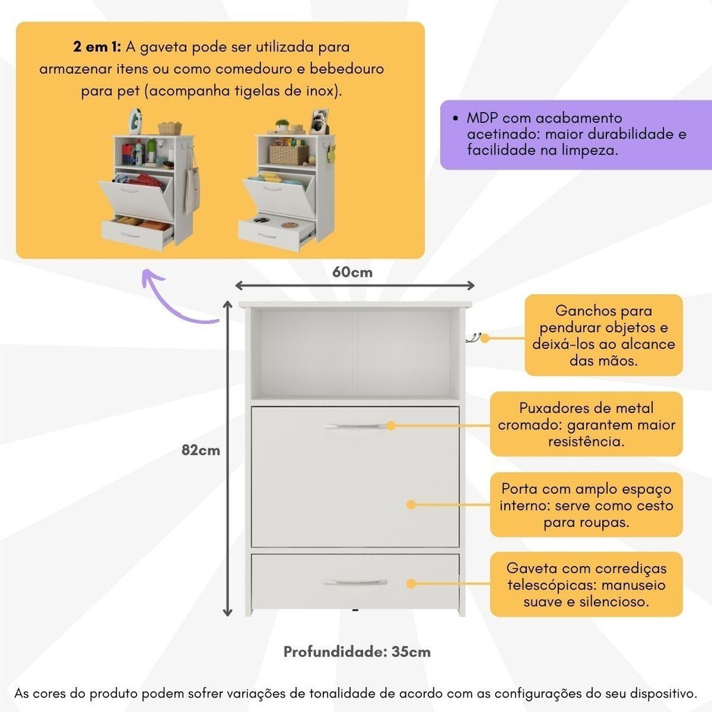O Balcão de Lavanderia Multiuso 1 Porta 1 Gaveta Multimóveis MP5057 é produzido em MDP (15mm) com acabamento acetinado, proporcionando durabilidade e resistência. Com amplo espaço interno, possui 1 porta e 1 gaveta com corrediças telescópicas, que proporcionam um manuseio suave e silencioso. O rodízio abaixo da gaveta garante sua estabilidade e movimentação segura. Conta com uma prateleira (suporta até 6kg) e tampo (suporta até 7kg) para apoiar acessórios e objetos decorativos, deixando o ambiente com a sua cara. O balcão ainda conta com 2 ganchos metálicos para pendurar itens e mantê-los ao alcance das mãos. Funcional, a gaveta pode ser utilizada para armazenamento ou se transforma em comedouro e bebedouro para bichinhos de estimação, acompanhando 2 tigelas para água e ração. Os puxadores de metal cromado adicionam um toque sofisticado ao móvel. Seja para otimizar o espaço da sua casa ou trazer uma solução prática para o dia a dia, este balcão é a opção perfeita. Conteúdo da Embalagem: 1 (um) Balcão Multiuso Manual de Montagem Kit Ferragem Dimensões do produto montado: Altura: 82cm | Largura: 60cm | Profundidade: 35cm *Você pode consultar as medidas detalhadas na imagem técnica do produto. *Obrigatório fixar o balcão na parede. *As cores do produto podem sofrer variações de tonalidade de acordo com as configurações do seu dispositivo. Imagem meramente ilustrativa. Decoração não acompanha o produto. O produto será entregue desmontado e não disponibilizamos o serviço de montagem.