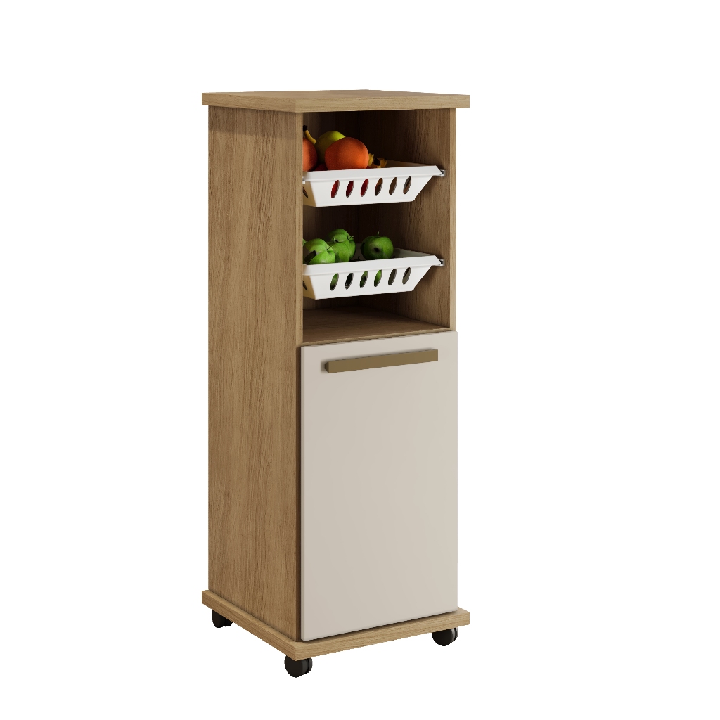 Leve para sua casa a Fruteira Paraná - Praticidade e Estilo em um Único Produto! A Fruteira Paraná é a solução perfeita para tornar sua cozinha mais organizada, prática e cheia de estilo. A Fruteira Paraná é super fácil de movimentar, graças aos pés com rodinhas. Assim, você pode levá-la para qualquer canto da cozinha conforme sua necessidade. A praticidade vai além com a presença de uma porta e uma prateleira extras, tornando a organização de coisas como objetos, condimentos e utensílios muito mais simples. Equipada com 2 cestos de plástico removíveis, proporciona o espaço ideal para armazenar suas frutas frescas e legumes de forma organizada Essa combinação esperta não só ajuda a otimizar o espaço, mas também facilita o acesso aos seus alimentos e utensílios do dia a dia. Se você quer algo que seja eficiente e ainda tenha um visual bacana, a Fruteira Paraná é a escolha certa. Características Principais: - Estrutura resistente em MDP 15mm com acabamento semi-brilho. 2 cestos removíveis para frutas e legumes. - Pés com rodízios para fácil mobilidade. - Porta articulada com dobradiça metálica. - 1 prateleira interna para objetos, condimentos e utensílios. Dimensões: Altura: 103 cm Largura: 39 cm Profundidade: 39 cm Produto Precisa de Montagem? Sim, sugerimos a contratação de um profissional o Número de Portas: 1 Número de Gavetas: Sem gavetas Tipo de Pé: Rodizios Número de Prateleiras: 2 Material da Dobradiça/Trilho da Porta: Metal Possui Fruteira: Sim Tipo de Porta: Articulada Peso Suportado: 35 Kg Acompanha: Manual de Montagem Kit de Montagem Montagem e Envio: A montagem é de responsabilidade do comprador, sendo fornecido um manual detalhado e kit de montagem. O produto é enviado por transportadora, garantindo segurança durante o transporte. Recomendamos a montagem por um profissional para garantir a qualidade e durabilidade. Observações Importantes: As cores podem variar devido às configurações do monitor. Não nos responsabilizamos por despesas relacionadas a transporte por escadas/elevadores, guinchos ou içamento do produto, sendo a responsabilidade do cliente.