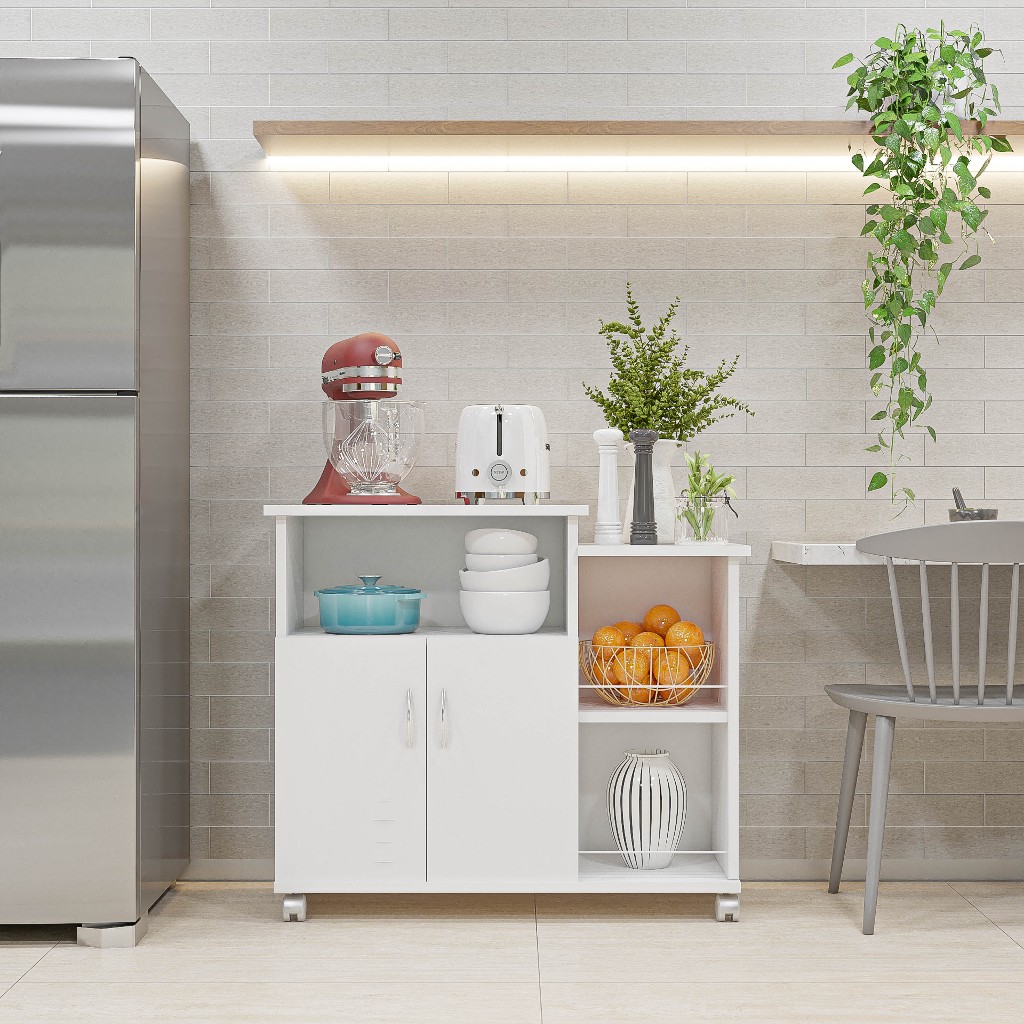 Pronta Entrega - Envio Imediato - Mais Vendido - Enviamos para Todo o Brasil Além de transformar sua cozinha em um espaço moderno e organizado, nossa fruteira e suporte de micro-ondas são versáteis o suficiente para se adaptarem a outros ambientes da sua casa. Este armário multifuncional não só adiciona estilo e praticidade à sua cozinha, mas também pode ser utilizado em diferentes áreas da casa, como salas de jantar, áreas de serviço, escritórios ou até mesmo quartos, para atender às suas necessidades diárias. Fabricado com materiais de alta qualidade, oferece durabilidade e estabilidade em qualquer ambiente. Descrição: -Altura: 72cm -Largura: 92cm -Profundidade: 34cm -Tampo menor: 30cm x 32,5cm -Tampo maior: 60cm x 34cm -Fruteiras: 28cm altura x 30cm largura -Parte interna da porta: 41cm altura x 56cm largura -Nicho em cima das portas: 21,5cm altura x 55cm largura Características: -Material: MDP -2 Portas com dobradiças metálicas e puxadores PVC cromados -Não possui prateleiras internas -Suporta 25kg distribuídos -Possui 5 rodízios -Pintura UV Branca -Acabamento em alto brilho