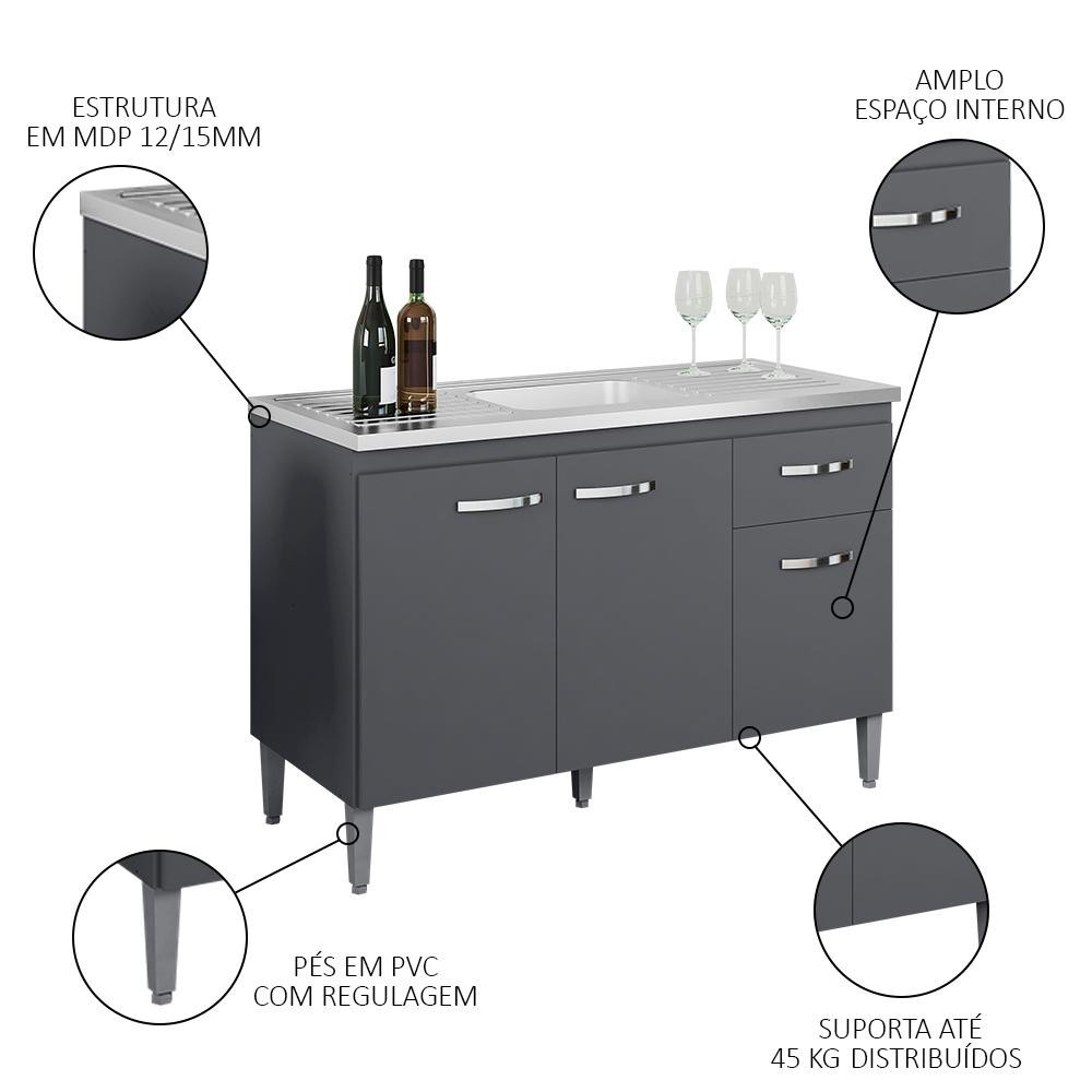 Balcão Gabinete Com Pia Inox 120cm 3 Portas e 1 Gaveta Gabriela Cinza - AJL Móveis