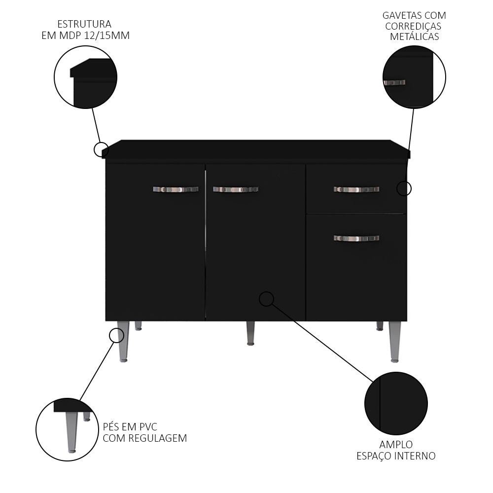 Balcão Gabinete Para Pia Com Tampo 120cm 3 Portas e 1 Gaveta Gabriela Preto - AJL Móveis