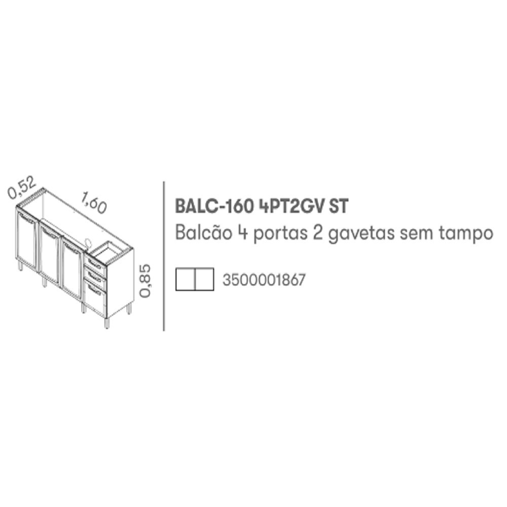 Balcão Cozinha Itatiaia New Premium 4 Portas 2 Gaveta IG4G4-160 Fabricado em aço de alta qualidade, testado e verificado em laboratório próprio da Itatiaia, e que recebe em seguida tratamento químico específico para garantir durabilidade e proteção contra ferrugem. A pintura eletrostática a pó deste armário é feita com tinta atóxica, ecologicamente correta e, portanto, de aplicação segura e sem riscos aos operadores. Possui puxadores em ABS metalizado com acabamento onix, de acabamento resistente, leve, durável, bonito, com alta resistência à corrosão e a variações bruscas de temperatura. Acabamento: Aço Brilho Dobradiça: Metálica Corrediça: Telescópica Dimensão Altura: 85 cm Largura: 160 cm Profundidade: 52 cm Peso: 27 kg Garantia: 12 meses