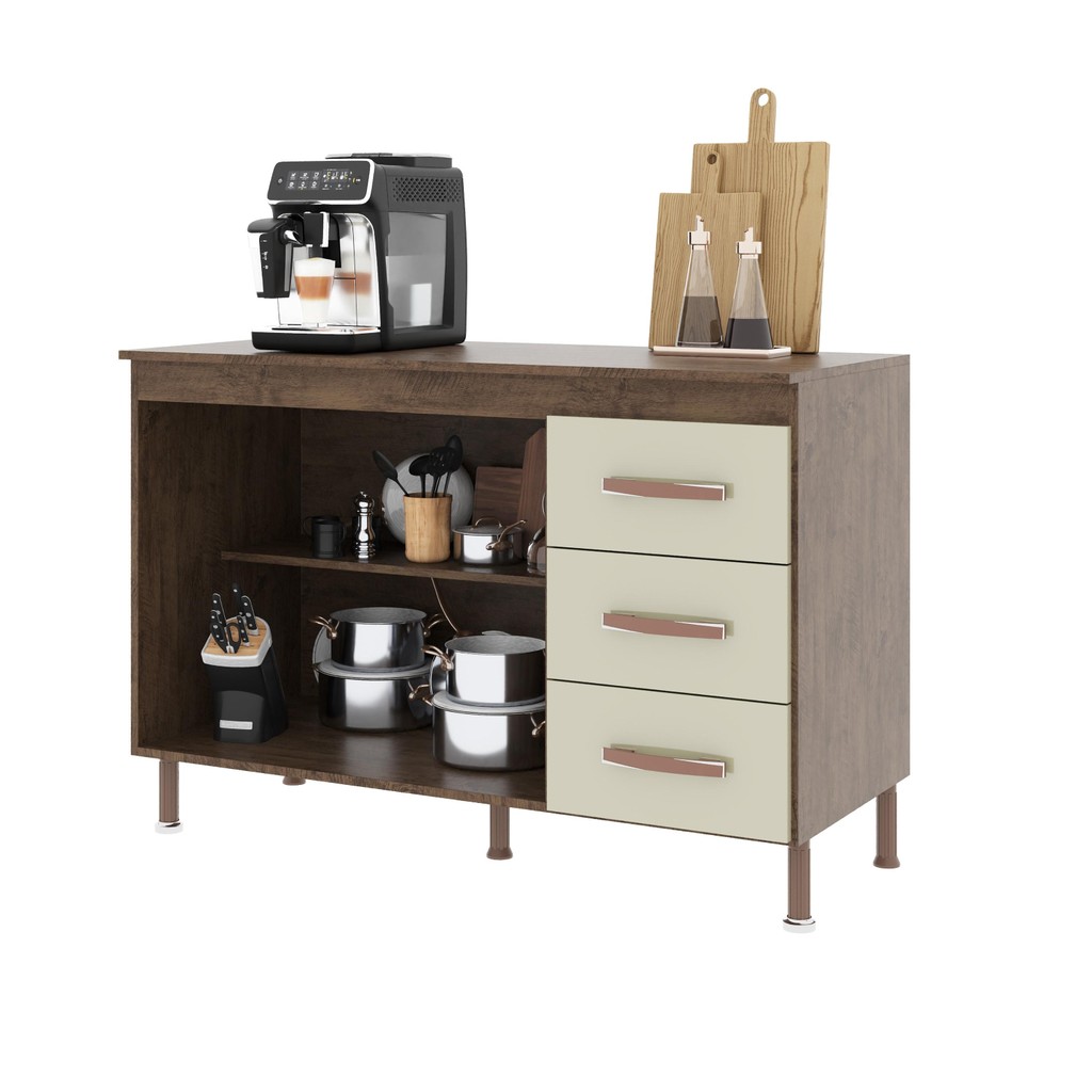 Balcão Modulado Para Cozinha Com Tampo Fidelitá Lisboa 120cm 2 Portas 3 Gavetas Noce/Off-White