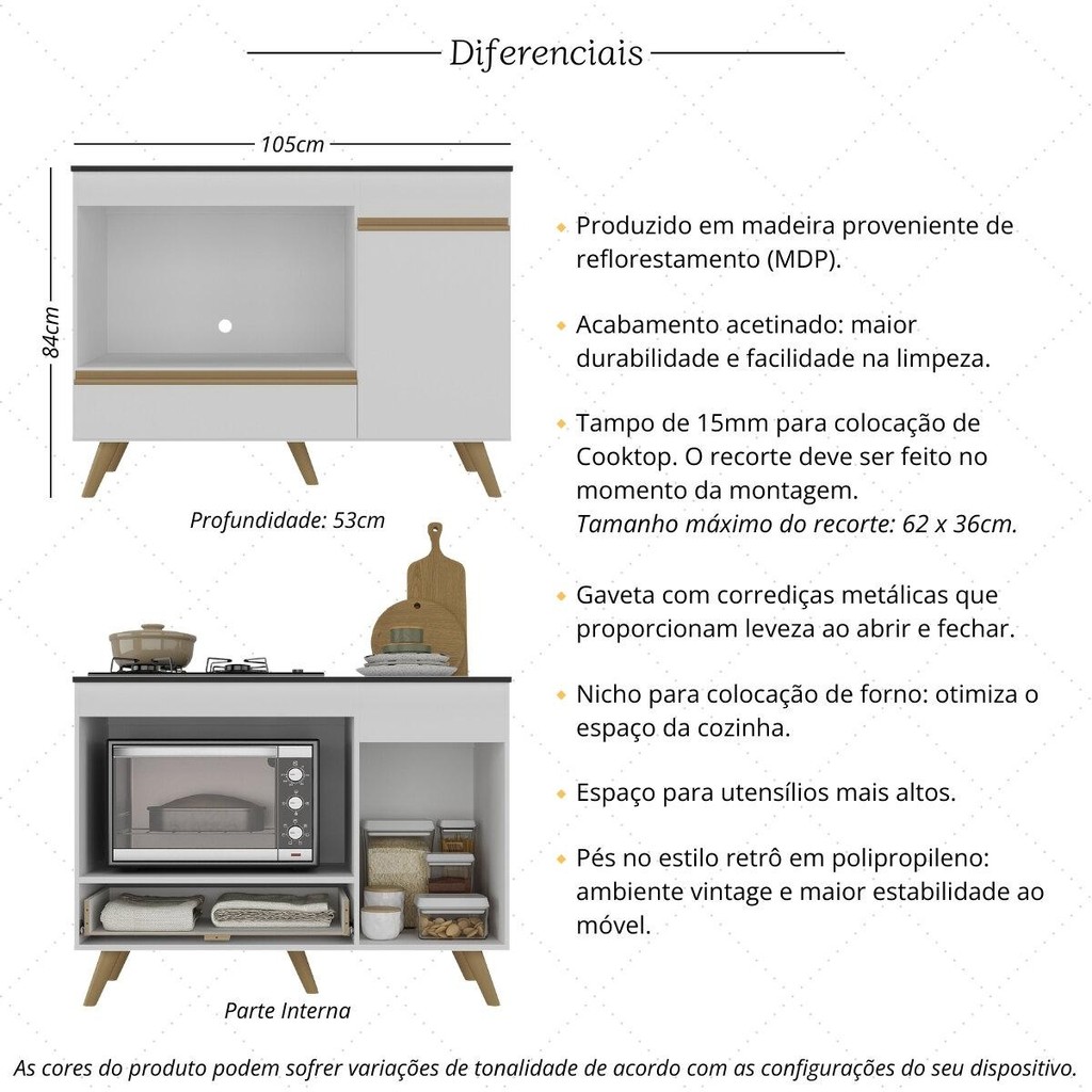 Seu novo aliado para uma cozinha estilosa e funcional espera por você! Com visual de cozinha planejada, o Balcão de Cozinha para Cooktop 4 ou 5 Bocas e Forno Veneza Multimóveis combina o charme do estilo vintage com a praticidade moderna. Produzido em madeira de reflorestamento (MDP), apresenta acabamento acetinado (cerca de 20% de brilho), oferecendo maior resistência e durabilidade ao móvel. Versatilidade: Possui tampo de 15mm recortável para Cooktop de 4 ou 5 bocas e espaço exclusivo para acomodar o seu forno (não compatível com forno embutido), otimizando o espaço da cozinha. O recorte do tampo deve ser feito no momento da montagem, conforme o tamanho do seu Cooktop (tamanho máximo do nicho: 62 x 36cm). Organização inteligente: Gaveta com corrediças metálicas para abertura suave e porta ampla que acomoda utensílios altos com facilidade. Estabilidade e estilo: Pés no estilo retrô em polipropileno elegantes que proporcionam estabilidade, além de puxadores modernos em ABS para dar o toque final ao ambiente. Conteúdo da Embalagem: 1 (um) Balcão para Cooktop com Tampo Kit Ferragem Manual de Montagem Especificações Técnicas: Dimensões do Produto Montado - Altura: 84cm | Largura: 105cm | Profundidade: 53cm Espaço para Forno - Altura: 39cm | Largura: 66cm | Profundidade: 49,5cm Material: MDP Acabamento: Acetinado Puxadores: ABS Pés: Polipropileno Corrediças: Metálicas Compatível com Cooktop: Sim (tampo não recortado) Nicho para Forno: Sim *Você pode consultar as medidas detalhadas na imagem técnica do produto. *As cores do produto podem sofrer variações de tonalidade de acordo com as configurações do seu dispositivo. Aqui na Loja Multimóveis, você pode concluir sua compra facilmente com toda segurança. A entrega é garantida e aqui você está em 1° lugar. Imagem meramente ilustrativa. Decoração e eletros não acompanham o produto. O produto será entregue desmontado e não disponibilizamos o serviço de montagem.