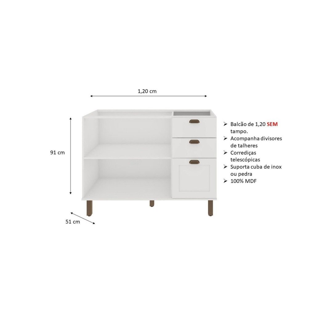 Balcão Para Cozinha 2 Portas 3 Gavetas Provençal sem Tampo Iluminata Branco Fosco
