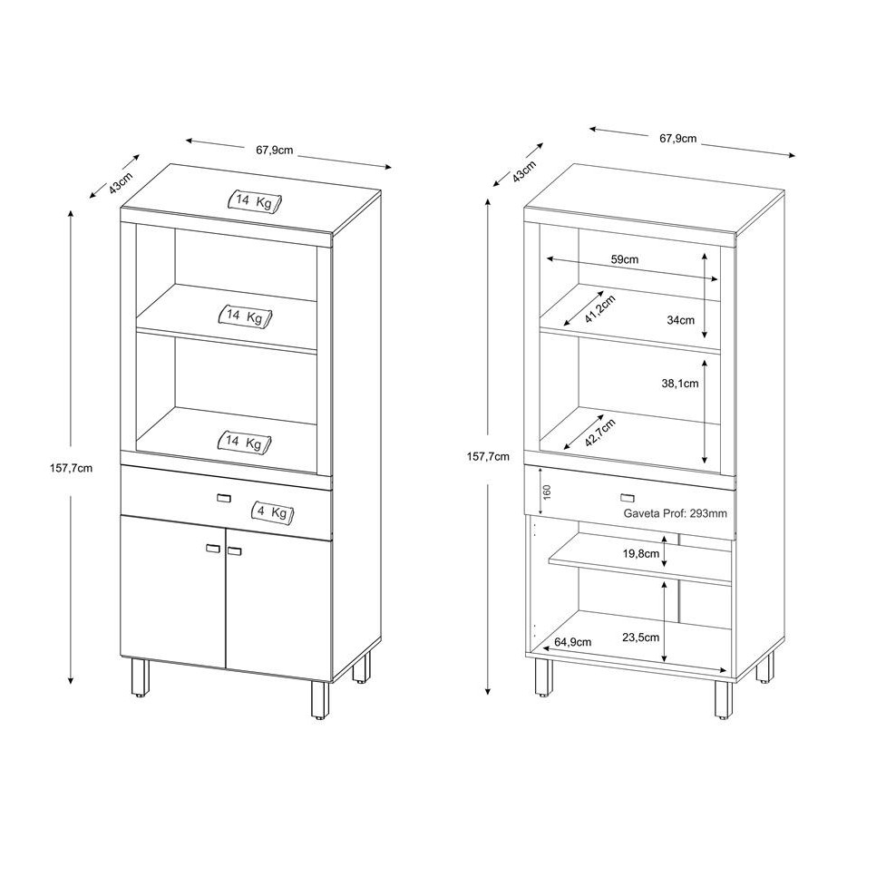 Balcão produzido com materiais resistentes, é a peça que faltava para completar sua cozinha, com estrutura em MDP de 15mm, pintura com acabamento em Uv (Brilho). Possui 02 portas com dobradiças metálicas, 01 gaveta com corrediças metálicas, puxadores, divisões funcionais com prateleiras resistentes ideais para acomodar forno e microondas, prateleiras que suportam até 14 kg e acompanha 4 pés quadrados. Este móvel chegará em sua casa separado em 01 volume. Especificações: - Altura: 157,7 cm - Largura: 67,9 cm - Profundidade: 43 cm - Sistema de Montagem: Parafusos, minifix e cavilhas. - Recomendação de Limpeza: Limpar com pano seco para retirar o pó. Não aplicar produtos abrasivos. - Forno e Microondas Não Inclusos. - Produtos de Enfeite Não Estão Inclusos.