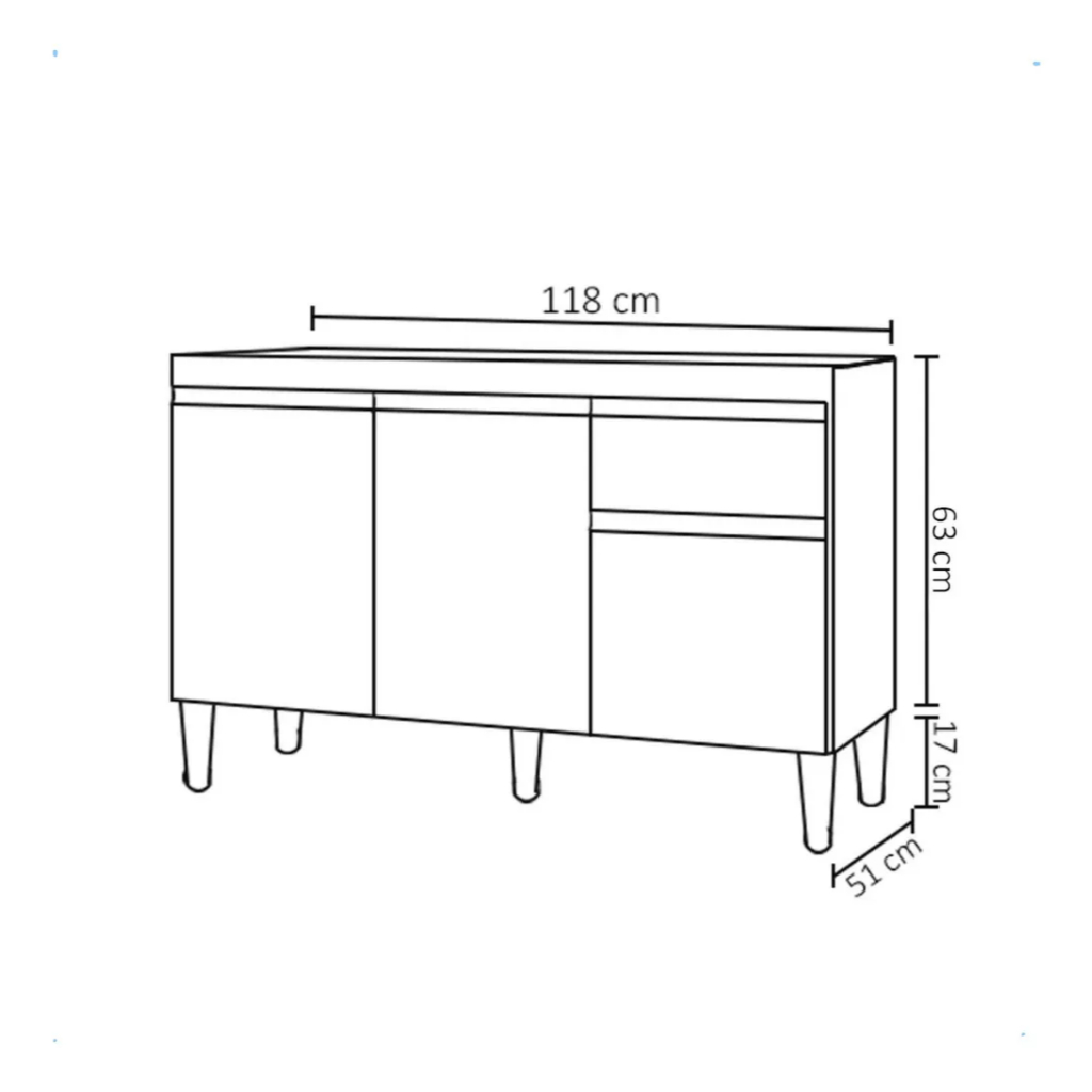Balcão Tatiane para pia de 1,20 - Sem Tampo NÃO ACOMPANHA TAMPO E NEM PIA Características: Produção 100% MDP Pintura em U.V Balcão 3 Portas 1 gaveta Para pia de 120 cm Puxador em PVC Pés em PVC Lindo design Dimensões Balcão: Altura: 80 cm Largura: 118 cm Profundidade: 51 cm Observação: O produto vai desmontado e embalado, a montagem é por conta do comprador, e deve ser feita por um profissional, os objetos de decoração são meramente ilustrativos