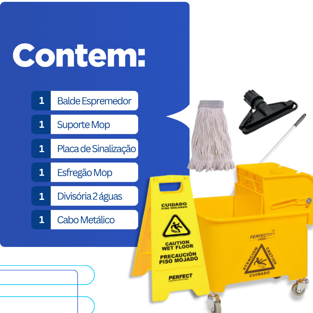 Balde Com Espremedor Mop 20 Litros Esfregão Placa Piso Molhado Carrinho Limpeza Com Doblô Kit Essencial Perfect Condor