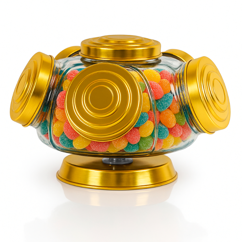 Porta Doces Baleiro Giratório 5 Potes - Elegância e Funcionalidade em um Único Item! Cores Disponíveis: Prata, Cobre e Dourado – Escolha a que mais combina com o seu estilo! Transforme o seu espaço com o Baleiro Artesanal Giratório 5 Potes, um item que une charme retrô e funcionalidade moderna. Perfeito para quem busca produtos únicos e atemporais, ele é ideal tanto para estabelecimentos comerciais quanto para decorar a sua casa, seja na sala de estar, na cozinha ou em salões de festas. Destaques do Produto: Vidro Transparente: Permite visualizar o conteúdo de cada pote, seja para balas, doces, cápsulas de café ou outros itens decorativos. Design Giratório: Prático e elegante, facilita o acesso a todos os potes. Acabamento Resistente e Sofisticado: Feito com materiais de qualidade, garantindo durabilidade e um visual premium. Toque Artesanal: As pequenas imperfeições, como variações na espessura ou bolhas no vidro, são a prova de que cada peça é única e feita com cuidado manual. Características: Material: Vidro artesanal espesso Capacidade por Pote: 500ml Capacidade Total: 5 potes Rolamento Axial Tampa Rosqueável em Plástico Resistente Pintado Base Firme com Rolamento Cor: Prata, Cobre e Dourado Dimensões: Altura: 17cm Largura: 27cm Profundidade: 27cm Diâmetro do Bucal do Pote: 8cm