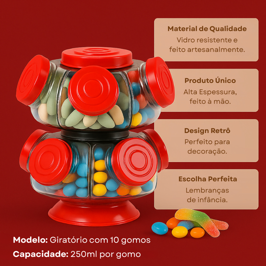 Na Vidro&Decor, acreditamos que cada peça decorativa é uma oportunidade de transformar seu espaço e resgatar memórias queridas. Apresentamos nosso encantador Baleiro Giratório Retrô de Vidro Artesanal, uma peça única que une funcionalidade com design clássico e estilo vintage. Com um toque de nostalgia, este baleiro é perfeito para adicionar charme e praticidade ao seu ambiente. 🍬✨ Baleiro Giratório Retrô – Vidro Artesanal Espesso Um charme nostálgico que transforma qualquer ambiente! 😍 Nosso Baleiro Giratório Retrô da Vidro&Decor é muito mais do que um recipiente para doces — é uma peça decorativa cheia de estilo, memórias e praticidade! Disponível nas cores Prata, Cobre e Dourado, ele vai dar aquele toque especial à sua cozinha, sala ou mesa de festas. 🏡💫 🔄 Gire, escolha e aproveite! Com 10 potes de vidro espesso de 250ml cada, você pode armazenar doces, balas, chás, castanhas, petiscos e muito mais. A base giratória permite acesso fácil a cada compartimento — ideal para compartilhar com amigos e familiares! 👨👩👧👦💞 🍬Baleiros Pequenos Duplos 🎨Cor: Vermelho 📐Dimensões: 24 x 24 x 26cm 🍭Bucal: 5,5cm 🍫Capacidade por gomo: 250ml 🎨 Destaques: ✨ Estilo retrô que encanta e decora 🌀 Design giratório super funcional 💎 Acabamento refinado e durável 🍭 Ideal para doces, petiscos, snacks, chás ou até guloseimas para pets 🧼 Fácil de limpar e reutilizar 💡 Dica: Use-o em festas, recepções ou no seu cantinho do café. Além de útil, é um verdadeiro item de destaque na decoração! Transforme pequenos momentos em grandes lembranças com o toque retrô da Vidro&Decor. 💖