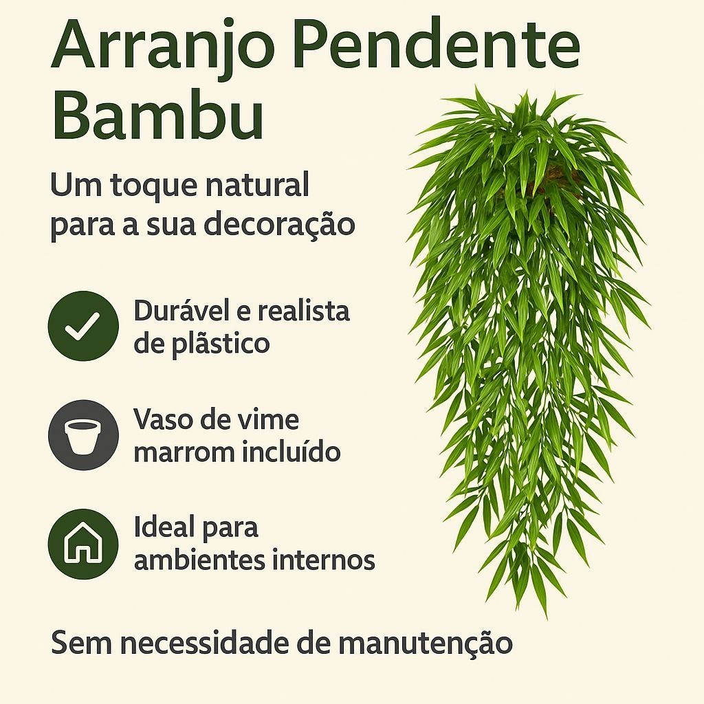 POR FAVOR LEIA A DESCRIÇÃO!!! ENVIO DE SÃO PAULO Arranjo Pendente Bambu Artificial – 80 cm Toque natural, sem manutenção! Transforme qualquer cantinho com o charme do Arranjo Pendente Bambu! Com folhas realistas e um lindo vaso de vime marrom, ele traz um visual leve, moderno e cheio de vida para sua decoração — sem precisar regar! Detalhes do produto: * Altura total: 80 cm * Planta artificial de plástico resistente * Vaso de vime marrom incluso * Ideal para prateleiras, paredes, varandas ou salas * Não precisa de água nem sol Perfeito para: Decoração prática e sofisticada Ambientes internos Quem ama verde, mas não tem tempo para cuidar! Leve mais estilo para sua casa com um toque verde sem complicação! QUALQUER DUVIDA ENTRE EM CONTATO ATRAVÉS DO CHAT.