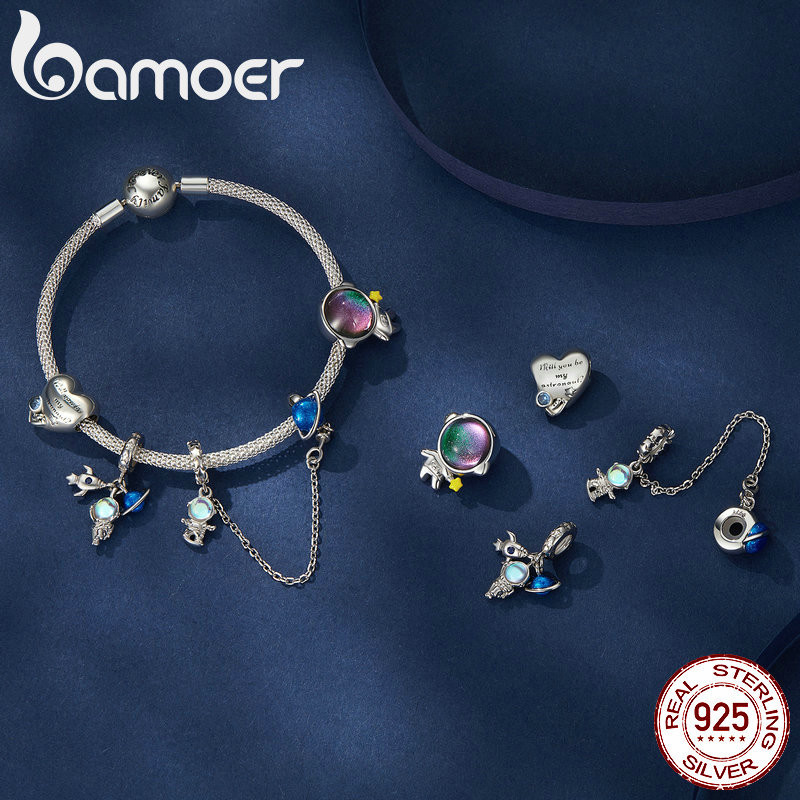 Bamoer 925 Astronauta De Prata Esterlina Pendurado Com Contas Encantos Em Forma De Coração Para Mulheres Pulseira E Colar Bijuteria Fina