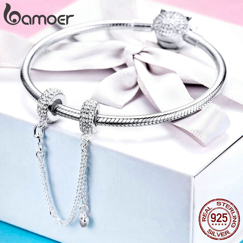 Bamoer 925 Prata Esterlina Corrente De Segurança Amor Coração Encantos Rolha Pingente DIY Para Pulseiras Jóias SCC1112