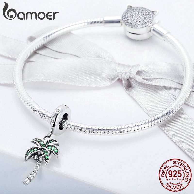 Bamoer 925 Real Silver Coco Árvore Charme Verde CZ Pingente fit Pulseiras DIY Fazer Jóias SCC697