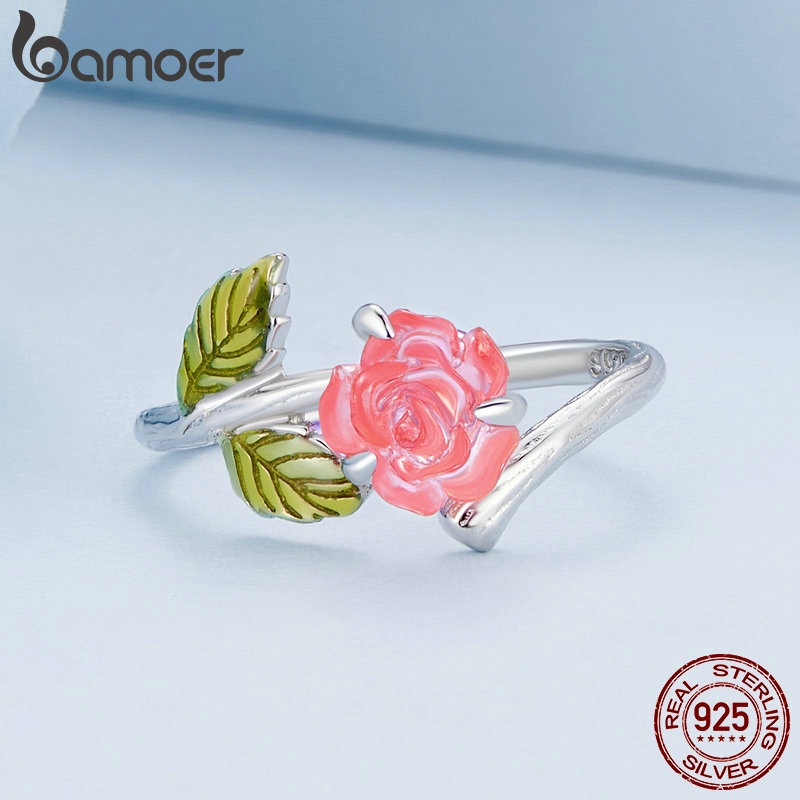 Bamoer 925 Silver Sterling Crystal Rose Open Ring Jóias De Moda Ajustáveis Para Mulheres