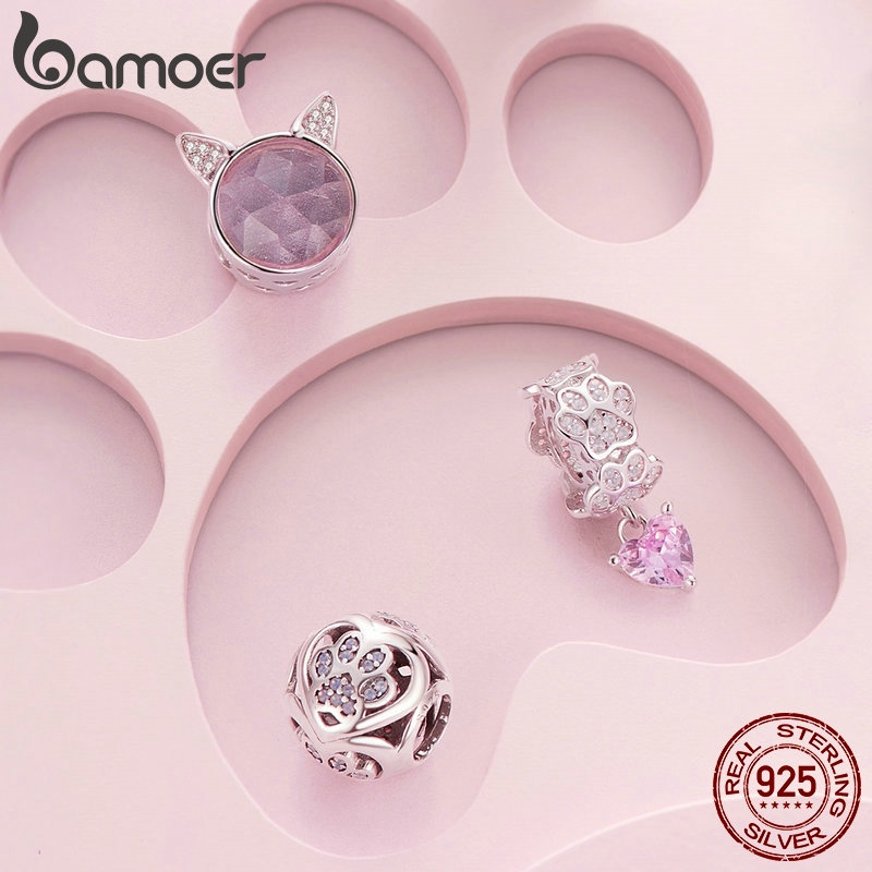 Bamoer 925 Silver Sterling Pink Paw Print Pendant E Beads DIY Fashion Jewellery Para Presentes De Aniversário Feminino