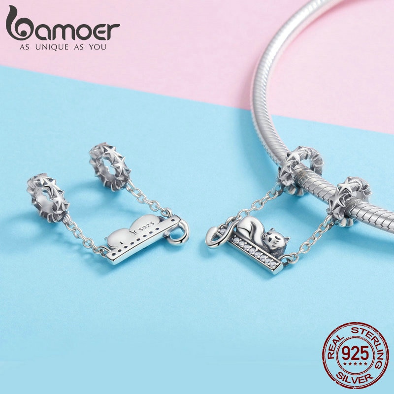 BAMOER 925 Sterling Silver Adorable Cat Star Charms Star Pave Charm Fit Bracelet & Necklaces DIY Jewelry Christmas Gift SCC856