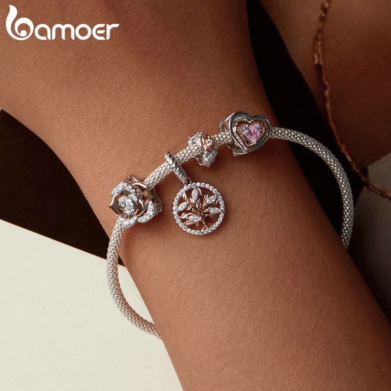 Bamoer 925 Sterling Sliver Charme Árvore Da Vida Rose Heart Hug Pendant Série De Acessórios Para Pulseira