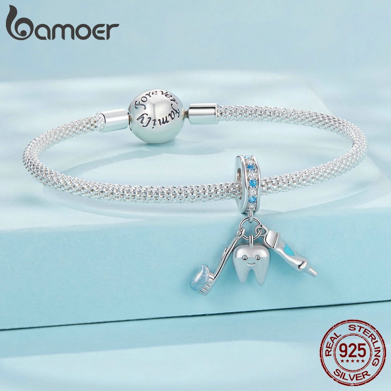 Bamoer 925 Sterling Sliver Charme De Fita Dentes Minúsculos Com Escova De E Pasta Desenhos Pingentes Acessórios Para Pulseira