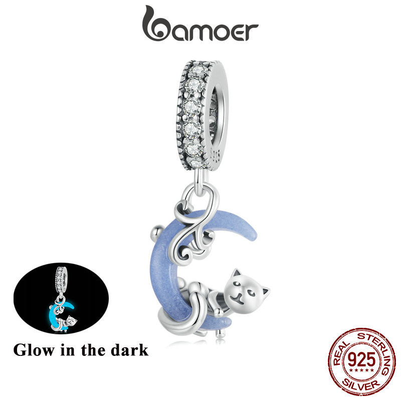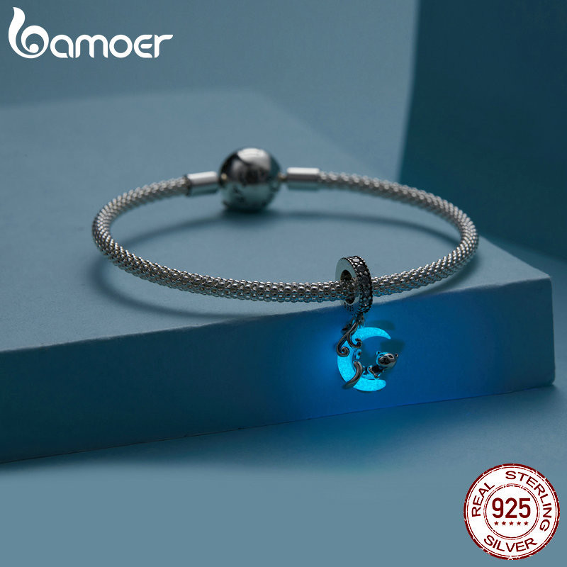 Bamoer 925 Sterling Sliver Charme De Fita Luminosa Gato Lunar Design Pingente Acessórios Para Pulseira SCC2747
