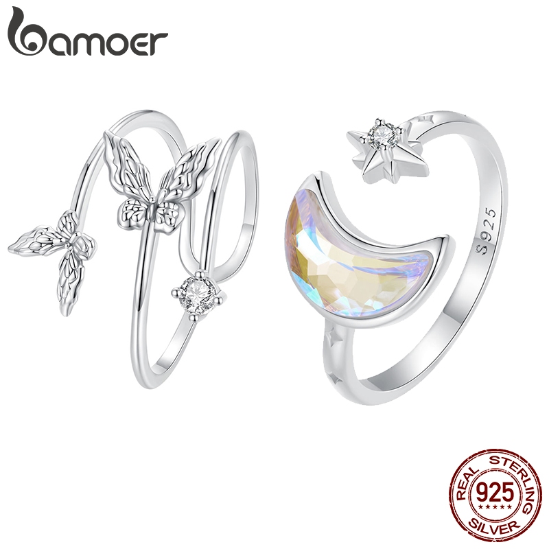 Bamoer 925 Sterling Sliver Ring Butterfly Moon Star Design Abertura Anel Jóias De Moda Presentes Para Mulheres