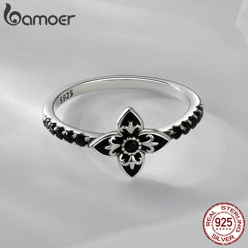 Bamoer 925 Sterling Sliver Ring Flower Jóias De Moda Preta Para Mulheres