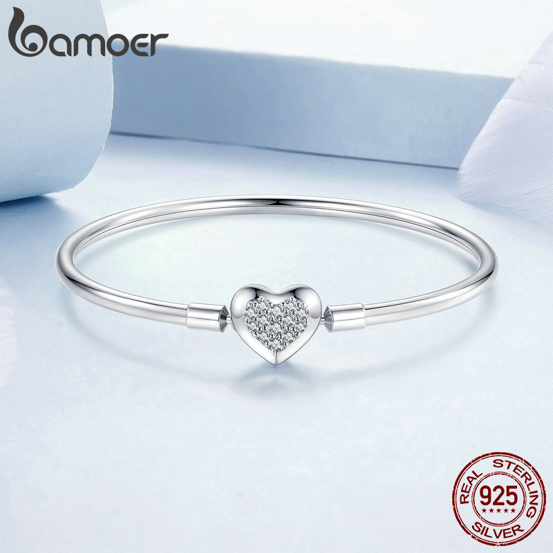 Bamoer Autêntico Pulseira De Prata 925 Sterling Charm Bracelet , Classic Heart/Shell Basic Bangle for Women Beads DIY Jewelry BSB192