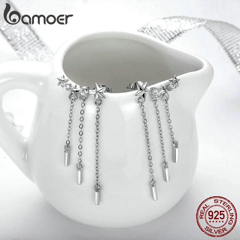 Bamoer Genuine 925 Sterling Silver Cadeia Longa Estrela Dazzling Cz Brincos Para As Mulheres Brincos Da Moda Jóias De Prata Sce399